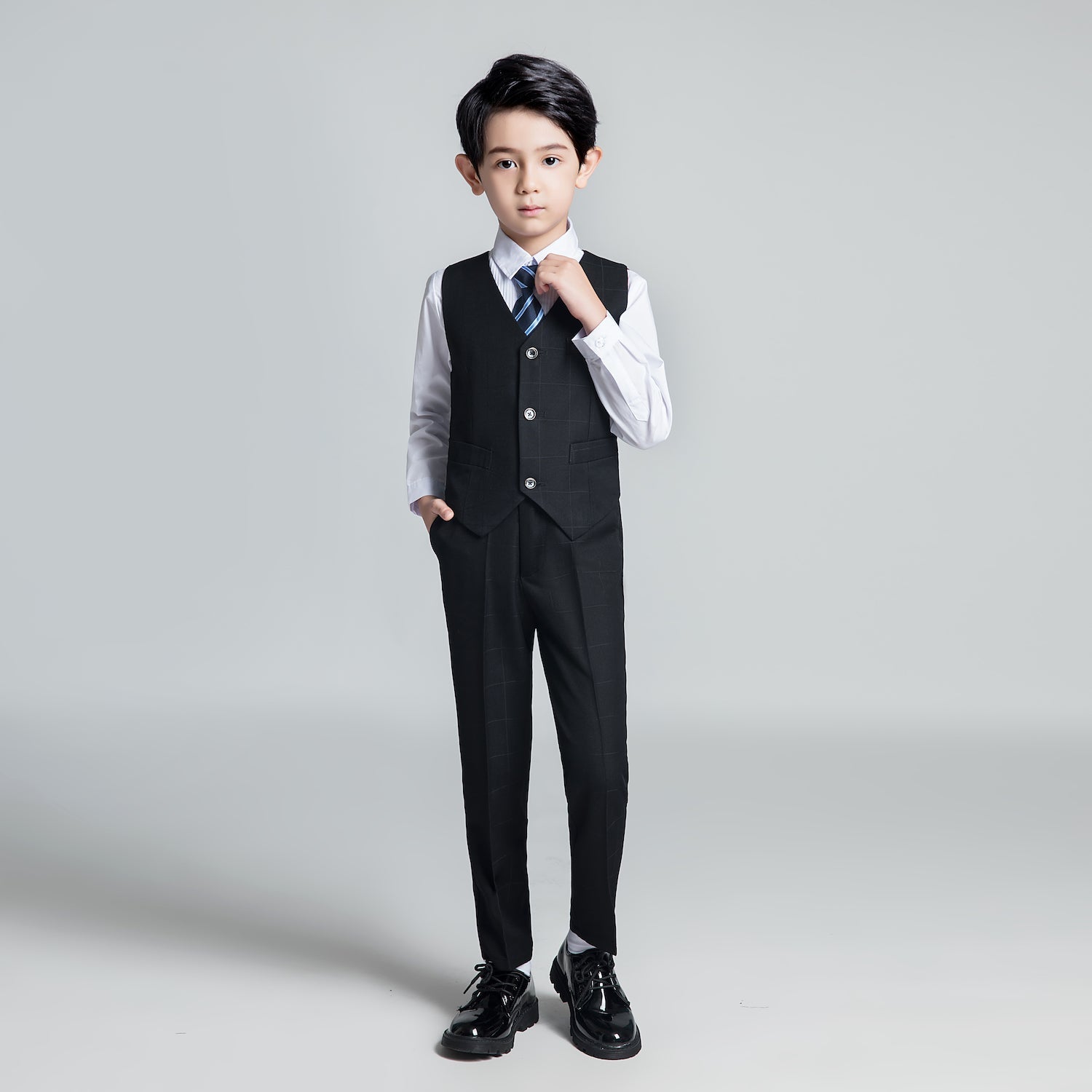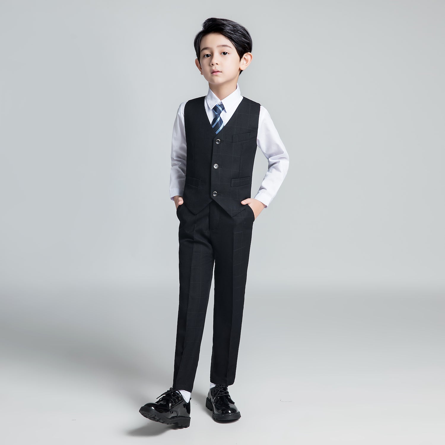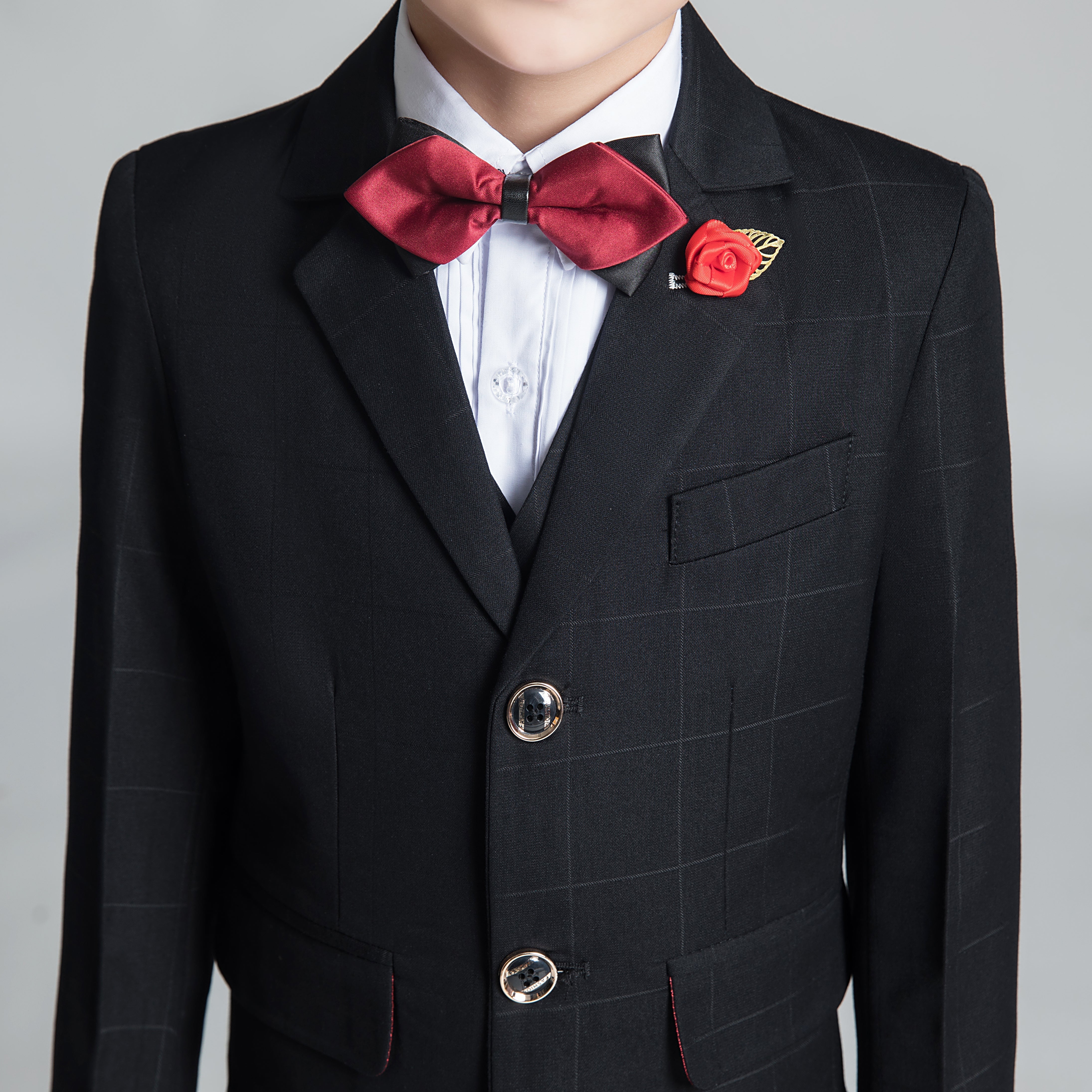 Package includes:Jacket + Pants + Vest+ Shirt + Tie, 5-Piece Suit.