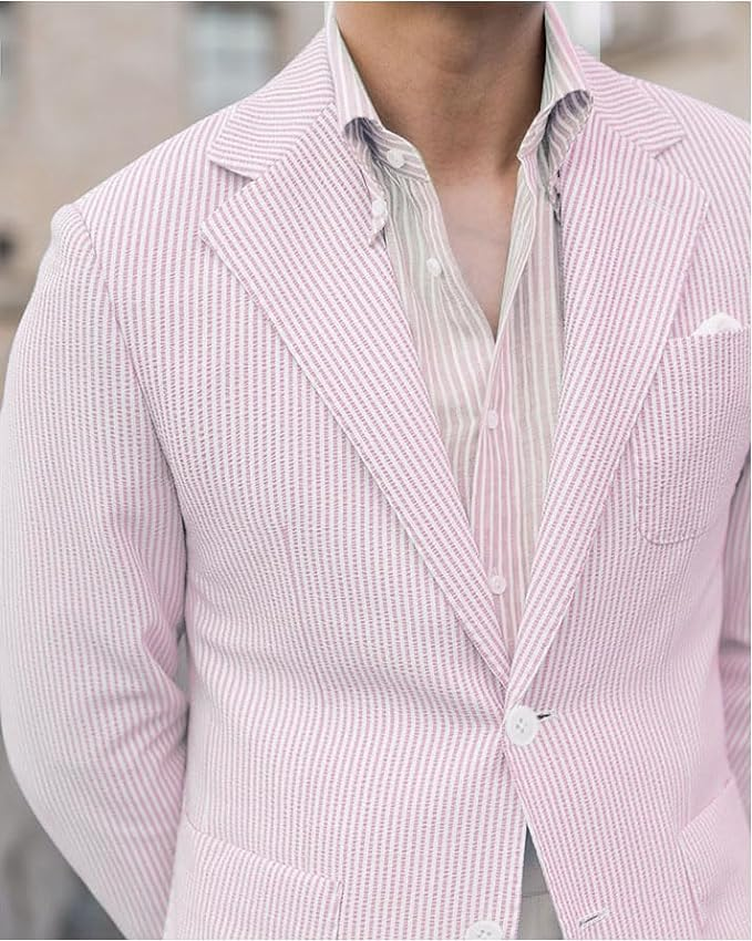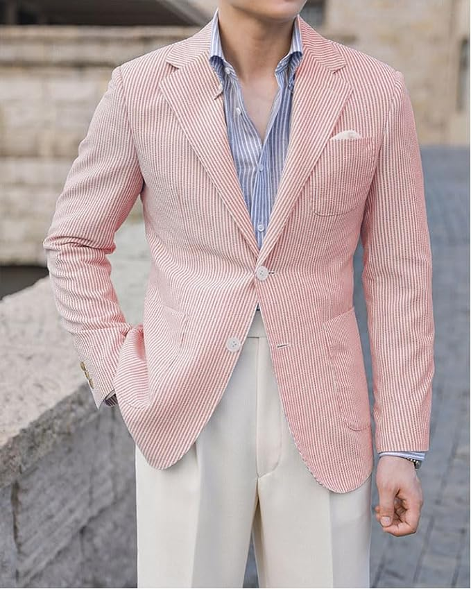 · Classic two-button blazer for men, made of lightweight and breathable seersucker, perfect for summer and other warm-weather occasions.