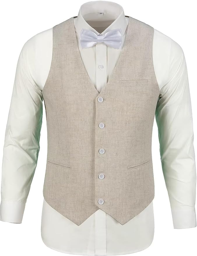 · 【Design】Kids linen suit for boys, summer suit for boys, notched lapel, fashion v neck vest, one button, chest side pocket, two real pockets, elastic waist, slim fit jacket vest pants set.